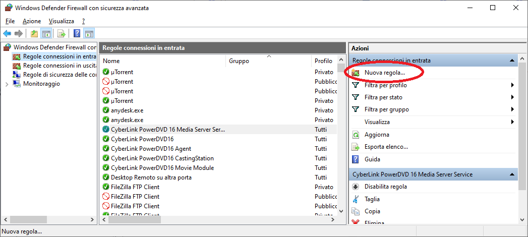 Nella schermata che segue, selezioniamo Regole Connessione in Entrata